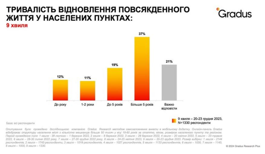 12% респондентів під час проведення останньої хвилі дослідження відповіло, що потрібно до року часу, щоб відновилось нормальне життя в населених пунктах. 1-2 роки відновлення прогнозує 11% опитаних, до 5 років – 19%, понад 5 років – 37%.