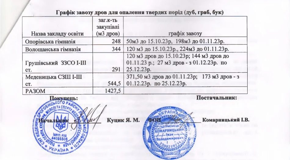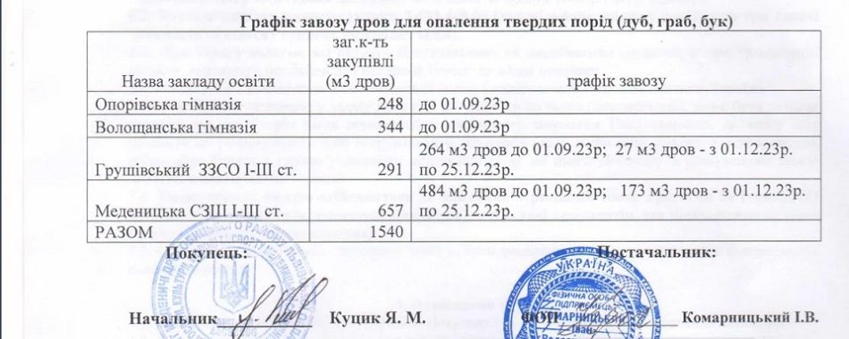 Тим часом у системі Прозоро 3 жовтня опублікували додаткову угоду до договору між відділом освіти та ФОП Комарницький Іван Володимирович за підписом Ярослава Куцика. Там передбачені нові терміни поставок дров до навчальних закладів. У договорі від 15 серпня було передбачено, що в Опорівську та Волощанську гімназії дрова мали бути поставлені до 1 вересня, у Грушівський ЗЗСО та Меденицьку СЗШ трьома партіями – до 1 вересня, 1 грудня та 25 грудня. Однак уже 3 жовтня, очевидно, після того, як заговорили про недостачу, терміни поставок значно посунули. Тепер перша партія дров в Опорівську та Волощанську гімназії, а також у Грушівський ЗЗСО має бути поставлена лише до 15 жовтня. А у Меденицьку школу аж до 1 листопада.