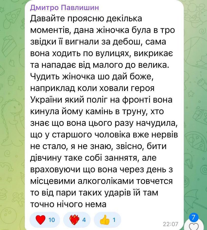 Також дивує, якщо м’яко сказати, реакція людей, які одні знімають, а інші просто проходять навіть не спробувавши це все зупинити. Люди яка б невинувата була жінка, це не дає право її так лупцювати. У такі складні часи в якій перебуває зараз країна потрібно навпаки гуртуватись і допомагати один одному, а не дозволяти такому відбуватись.