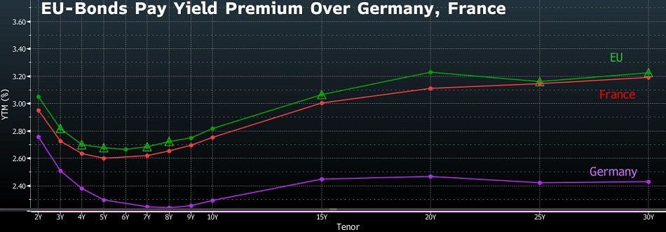 Одна з причин, чому інвестори закликають власників облігацій подолати ці сумніви, полягає в тому, що папери з рейтингом ААА високо цінуються – і тим більше після того, як минулого року США були позбавлені свого вищого рейтингу. Додатковий бонус: з причин, які включають тимчасовий характер випуску, існуючі облігації ЄС приносять інвесторам дещо вищу прибутковість, ніж Німеччина з таким самим рейтингом і навіть ніж Франція з нижчим рейтингом.