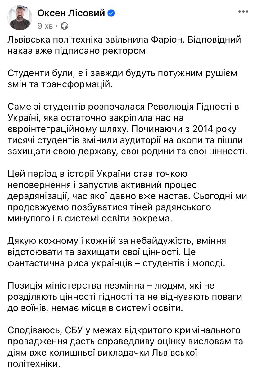 Міністр освіти Оксен Лісовий підтвердив звільнення Фаріон.