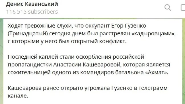 Серед російських пропагандистів повідомляється, що Гузенко сьогодні вдень був розстріляний “кадировцями”, з якими у нього був відкритий конфлікт