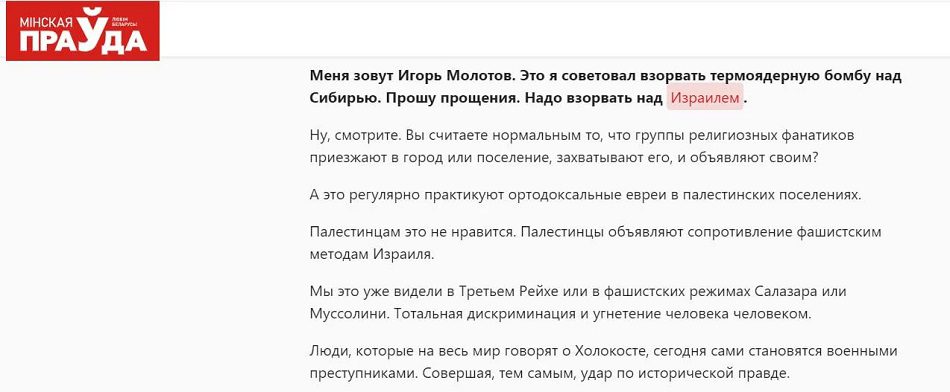 Пропагандистська газета Білорусі “Мінська правда”, підконтрольна адміністрації Олександра Лукашенка, опублікувала колонку співробітника RT Ігоря Молотова, де сказано, що “перемога Палестини на окупованих територіях (йдеться про Ізраїль – ред.) – це перемога Москви та Мінська”, передає DROBRO.
