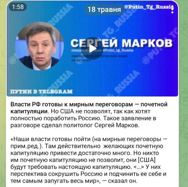 Кремль починає дозовано вводити в інформаційний простір намір “домовитися” з Україною. Близький до пропагандистського оточення Путіна політолог Сергій Марков стверджує, що влада ерефії готова до мирних переговорів, пише DROBRO.
