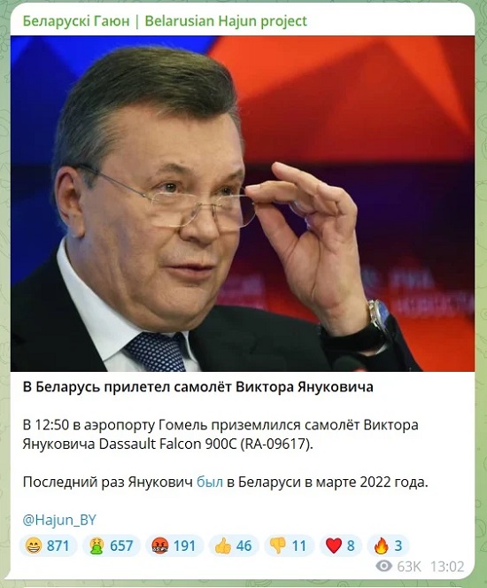 Сьогодні близько 13:00 до аеропорту Гомель прилетів літак колишнього українського президента Віктора Януковича, який самоусунувся від своїх обов’язків у лютому 2014 року, інформує ТГ-канал “Беларускі Гаюн” із посиланням на свої джерела, передає DROBRO.