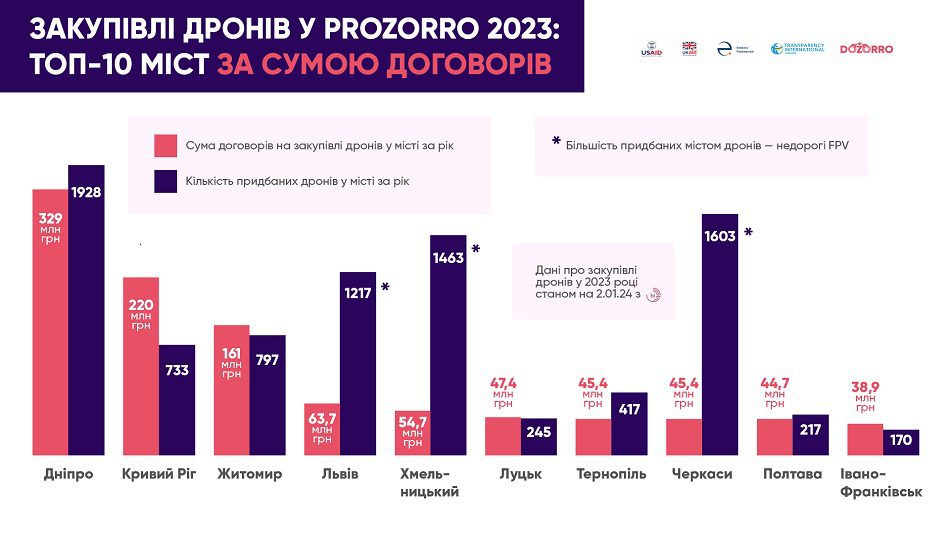 У самому Львові у 2023 році придбали 1217 дронів на 63,7 млн грн. Він посів четвертне місце за сумою договорів серед міських рад. Його обійшли Дніпро (329 млн грн), Кривий Ріг (220 млн грн) і Житомир (161 млн грн).