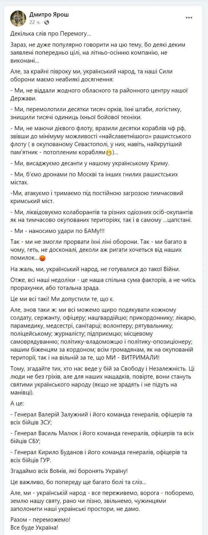 Ярош також відзначив операцію, в рамках якої Україна змогла завдати удару Байкало-Амурській магістралі. Він визнав низку помилок української армії, проте закликав народ країни готуватися до тривалої та важкої битви з російськими окупантами. Командувач УДА також подякував усім українцям і зазначив, що головним досягненням країни та народу стало те, що Україна змогла витримати напад орди російських окупантів.