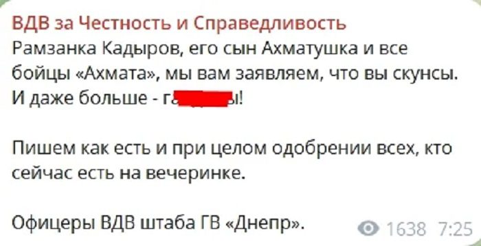 ВДВшники з боліт приєдналися до конфлікту, який виник між “кадирівцями” та відомим рашистським військовим-блогером Єгором Гузенком “Тринадцятим”, або “Гузно”. Терористи заступилися за товариша по службі і навіть почали погрожувати повторити чеченську війну. Відповідне звернення було опубліковано увечері 25 листопада на Telegram-каналі “ВДВ за Чесність та Справедливість”, який ведуть офіцери штабу угруповання “Дніпро”.