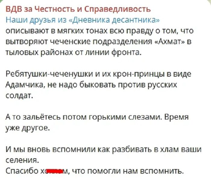 “Дитятки-чеченушки та їхні кронпринци у вигляді Адамчика (неповнолітній син голови Чечні Адам Кадиров – ред.), не треба бикувати проти російських солдатів. А то заллєтеся потім гіркими сльозами. Час уже інший. І ми знову згадали, як розбивати у мотлох ваші селища. Спасибі хо**ам (образлива назва українців – ред.), що допомогли нам згадати”, – написали рашистські ВДВшники.
