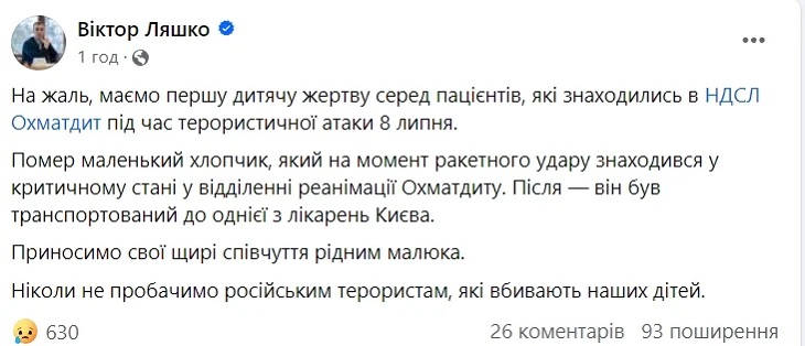 Він уточнив, що в момент російського ракетного удару хлопчик був у тяжкому стані в реанімації “Охматдиту”. Після його екстрено перевезли до іншої лікарні столиці, проте, на жаль, дитина не пережила цього випробування. “Ніколи не пробачимо”, – написав Ляшко.