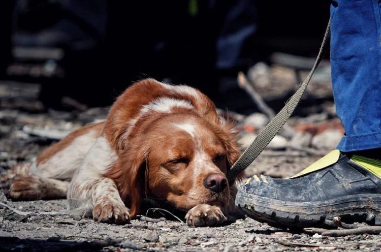 Пес-рятівник після кількох годин пошуку людей на руїнах багатоповерхівки в Умані, куди вранці 28 квітня влучила ракета РФ, заснув на завалі