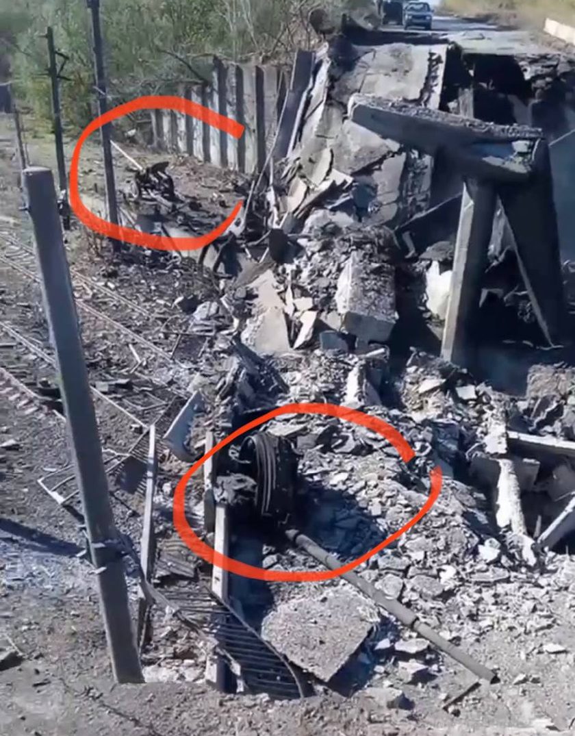 Поблизу зруйнованого мосту видно залишки танка “Т-80”, гаубиця “Мста-Б” 2А65, бронеавтомобіль “Ахмат”, вантажний автомобіль. Удар був такої сили, що в танка відірвало башню, а техніку розкидало, як іграшки. Неважко здогадатися про долю особового складу, що знаходився всередині військової техніки.