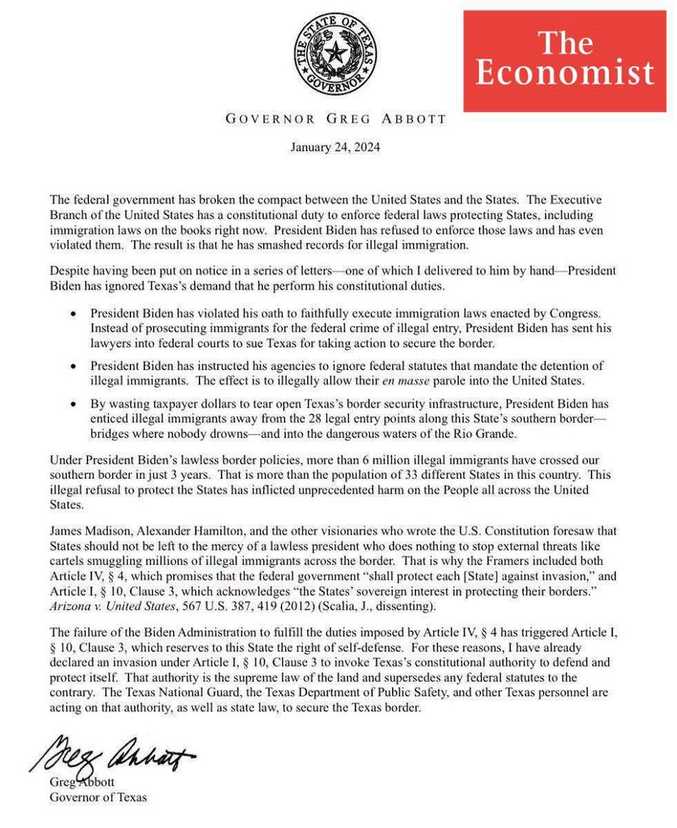 Техаські нацгвардійці відмовляються пропускати на кордон федеральних прикордонників. Ці дії підтримали штати Айдахо, Вайомінг, Північна Дакота, Небраска, Айова, Міссурі, Луїзіана, Алабама, Джорджія, Південна Кароліна. Губернатор Флориди Рон Десантіс, який нещодавно відмовився балотуватися в президенти США на користь Дональда Трампа, заявив, що підтримує закон про розширення діяльності Нацгвардії Флориди в Техасі під час протистояння з федеральною владою.