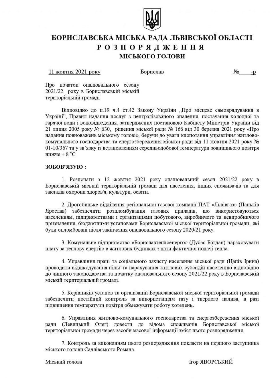 З 12 жовтня, на території Бориславської територіальної громади розпочинається опалювальний сезон 2021/22 року для всіх категорій споживачів