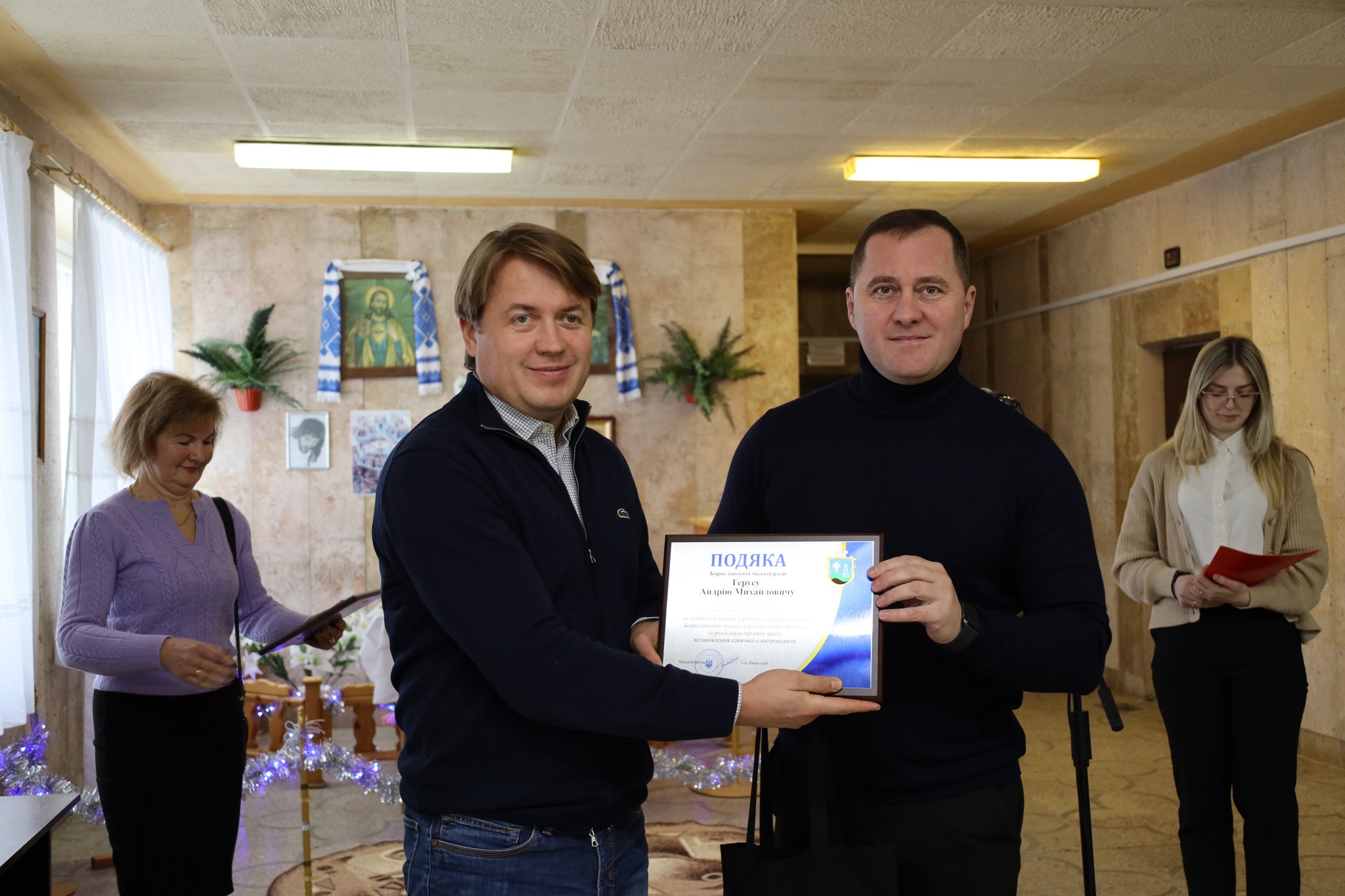 Міський голова вручив подяки Бориславської міської ради Народному депутату України Андрію Герусу за особистий внесок у розвиток інфраструктури Бориславської міської територіальної громади та за реалізацією проєкту щодо встановлення сонячної електростанції.