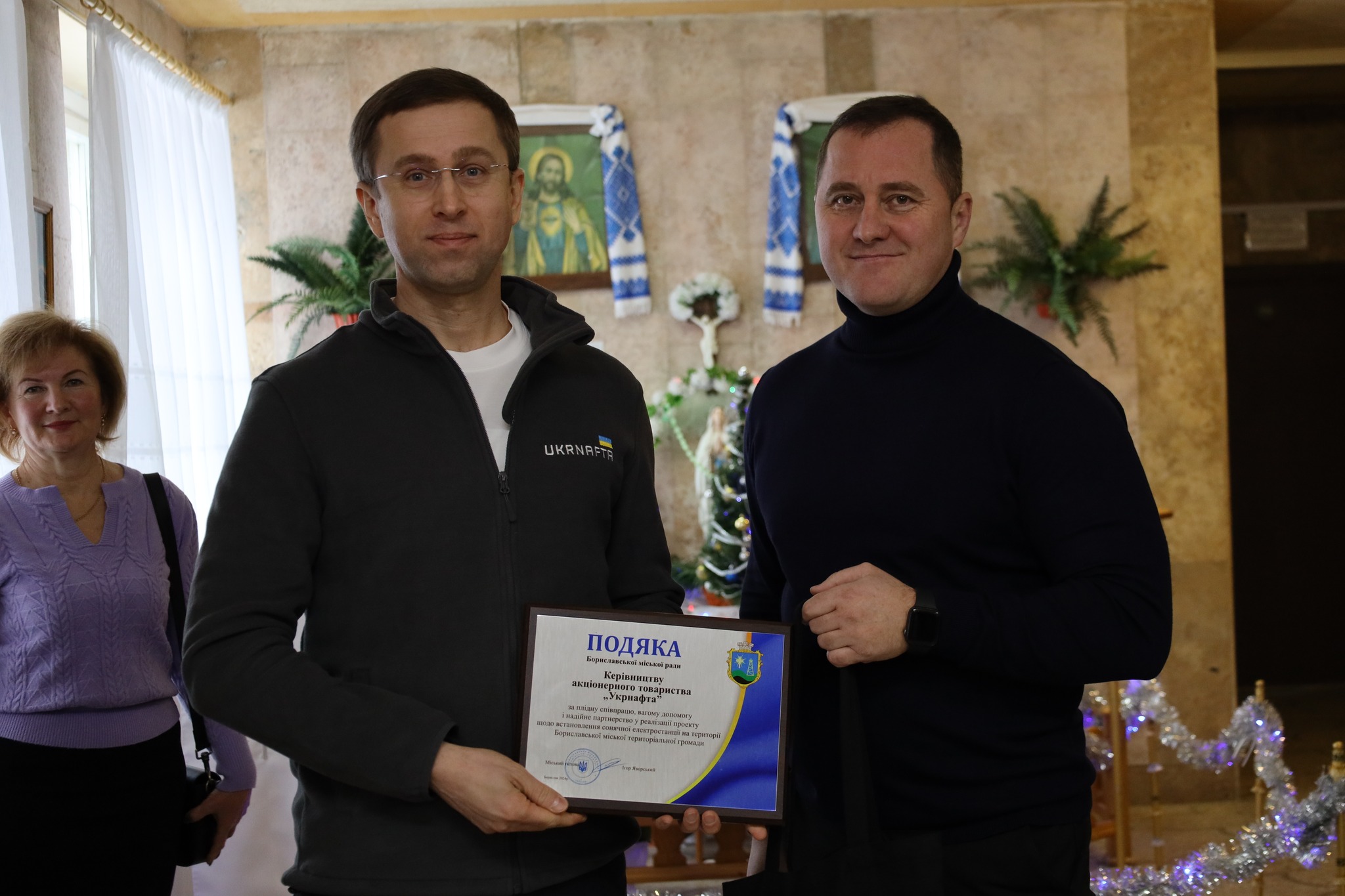 Подяку за плідну співпрацю, вагому допомогу, надійне партнерство у реалізації проєкту щодо встановлення сонячної електростанції на території Бориславської громади Ігор Романович вручив Керівництву акціонерного товариства “Укрнафта” в особі Сергія Корецького.