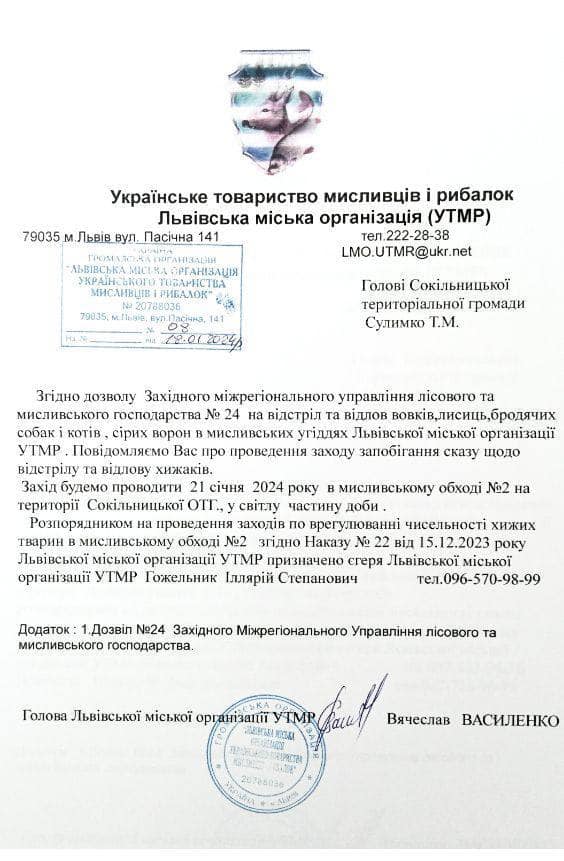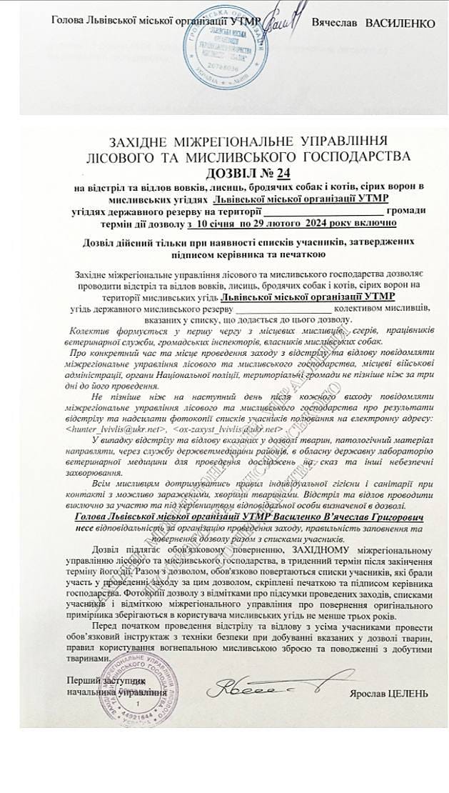 Як зазначається, згідно з дозволом Західного міжрегіонального управління лісового та мисливського господарства №24 планується «відстріл та відлов вовків, лисиць, бродячих собак та котів, сірих ворон в мисливських угіддях Львівської міської організації УТМР».