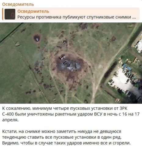 Фото виклав пропагандистський ресурс “Освєдомітєль”. Воно знято з висоти пташиного польоту, імовірно, за допомогою безпілотника. Удару було завдано в ніч на 17 квітня. І завдяки компактному розміщенню установок ЗСУ змогли парою ударів завдати величезної шкоди протиповітряній системі противника в окупованому Криму.