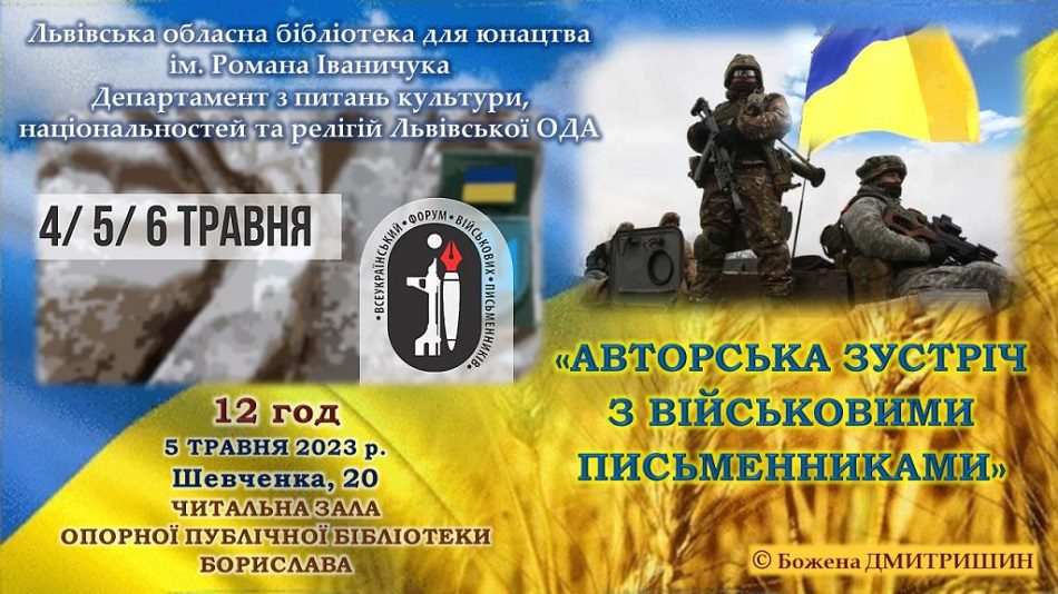 У п’ятницю, 5 травня, о 12:00 в читальній залі опорної бібліотеки відбудеться авторська зустріч з військовими письменниками. Такі заходи проходять в рамках V Всеукраїнського форуму військових авторів, передає DROBRO. Він об’єднує і військовослужбовців, і журналістів, які стали на захист рідної землі від початку повномасштабного вторгнення.