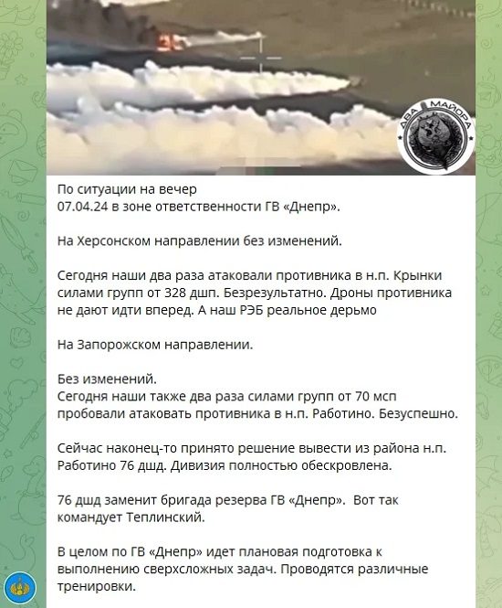 Проблеми в окупантів та в районі Кринок на лівобережжі Херсонщини. Z-канал запевняє, що 9 квітня армія терористів двічі намагалася штурмувати український плацдарм. Обидва рази виявилися невдалими.