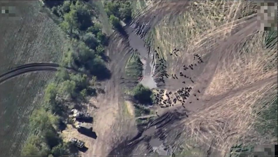 Ті, хто зміг вижити, розбігаються у різні боки. Видно три великі зони ураження. Приблизна кількість загиблих можна зрозуміти, побачивши знімок скупчення великої групи російських військових.
