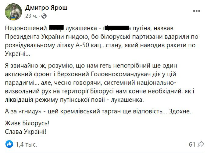 Образлива заява так званого “президента” Білорусі Олександра Лукашенка викликала обурення командувача Української добровольчої армії (УДА) Дмитра Яроша, який на своїй сторінці у соціальній мережі Facebook різко відповів білоруському диктатору. Він прокоментував реакцію Лукашенка на удар білоруських партизанів російським літаком “А-50”, який наводив ракетні удари по Україні, передає DROBRO.