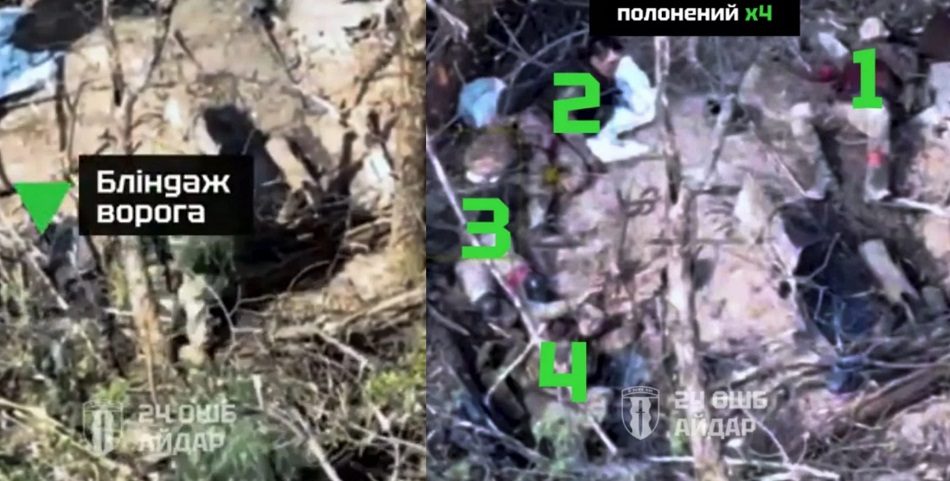 За діями воїнів батальйону “Айдар” спостерігав безпілотник, камера якого зафіксувала момент здавання росіян у полон. Чотири окупанти по черзі вийшли з бліндажу, їх роззброїли та перевели в інше місце на підконтрольній Україні території.